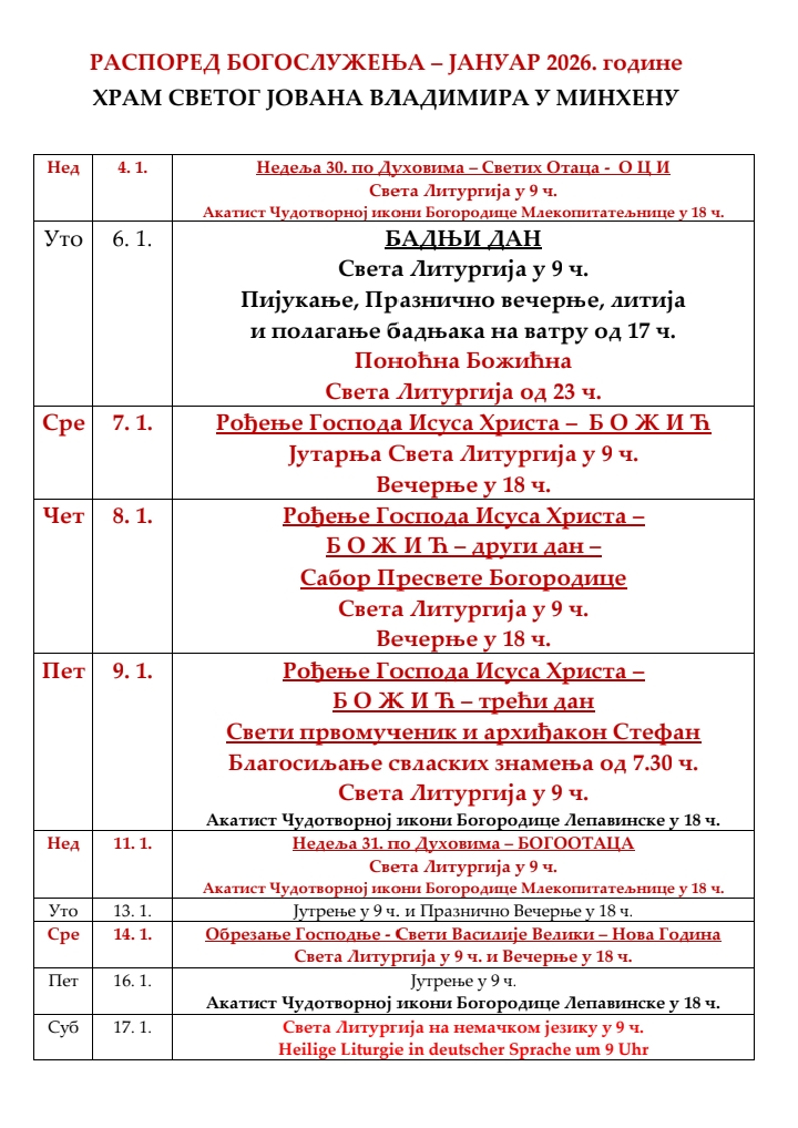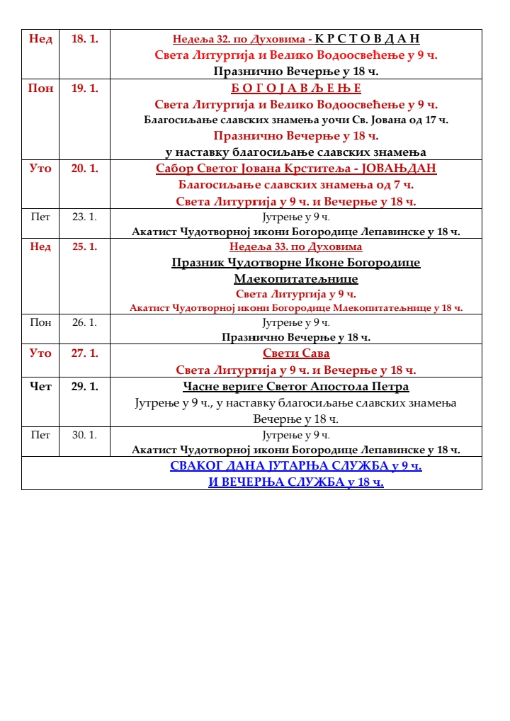 Распоред богослужења за месец јануар