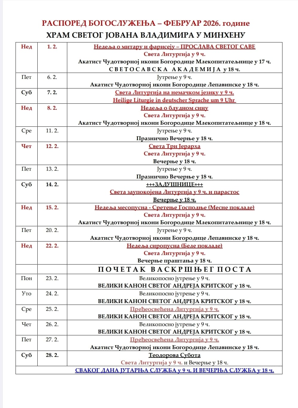 Распоред богослужења за месец фебруар