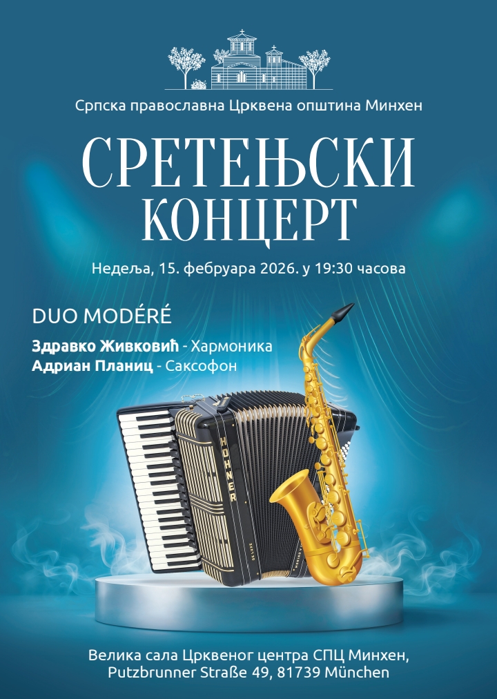Српска православна црквена општина Минхен, поводом празника Сретење и Дана државности Републике Србије, организује у недељу, 15. фебруара, са почетком у 19:30 часова, Сретењски концерт.
