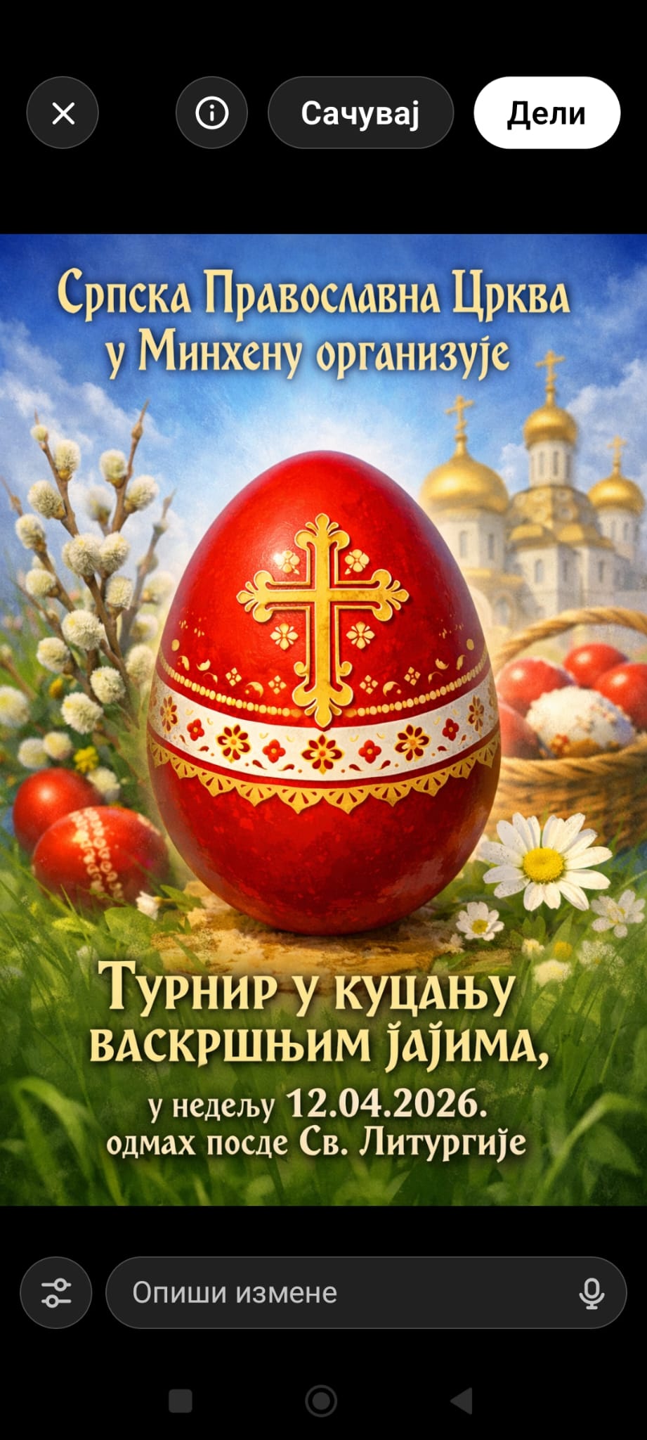 На Васкрс, 12.04.2026. године, наша Црквена општина у Минхену ( Перлах), организује турнир у куцању јајима, одмах после Св. Литургије (која почиње у 09:00 ч). Очекивано време почетка турнира је око 12:00 ч.